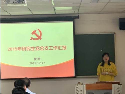 首先,魏薇对研究生党支部如何开展党建工作进行了培训,并作2019年度研究生党总支工作总结和2020年工作计划报告。接下来各研究生党支部书记就本支部一年来的组织生活等情况逐一进行了汇报。结合汇报情况,进行了研究生党支部“一先两优”评选。