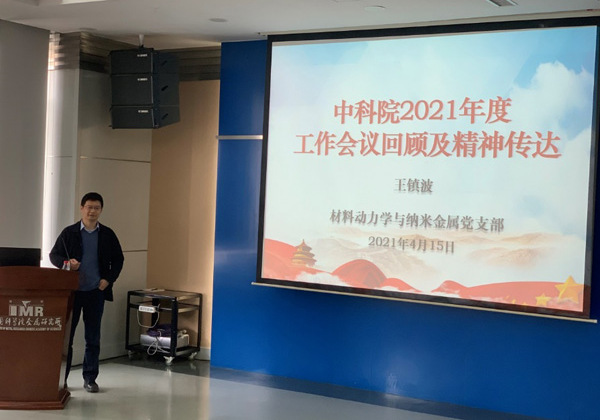 2021年4月15日下午,在师昌绪楼403会议室,材料动力学与纳米金属党支部组织召开了“学习贯彻中科院2021年度工作会议精神”宣传与研讨活动,耀彩网所长左良、材料动力学研究部主任李毅、沈阳材料科学国家研究中心副主任李秀艳参加活动并作交流报告,会议由支部书记王镇波同志主持,支部党员及分工会成员参加了会议。