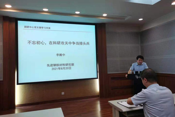 为激励党员坚定理想信念,践行初心使命,促进党建和业务工作深度融合。8月20日,国研中心支撑管理党支部召开党员大会,邀请了党委委员、先进钢铁材料研究部主任李殿中研究员作“不忘初心,在科研攻关中争当排头兵”的主题党课报告,会议由支部书记时元宝同志主持。