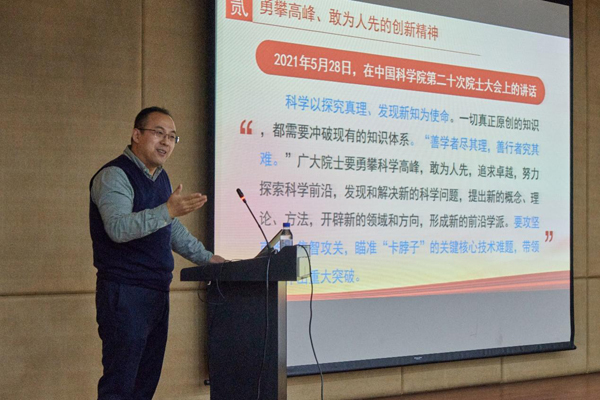 报告会上,刘洪阳老师从6个方面,和大家一同学习了习近平总书记关于科学家精神的重要论述。其一,我国科技事业取得的历史性成就,是一代又一代矢志报国的科学家们前赴后继、接续奋斗的结果。广大人才要继承和发扬老一辈科学家胸怀祖国、服务人民的爱国精神,心怀“国之大者”为国分忧、为国解难、为国尽责。其二,科学以探究真理、发现新知为使命。“善学者尽其理,善行者究其难。” 我国广大科技工作者要以与时俱进的精神、革故鼎新的勇气、坚忍不拔的定力,勇攀高峰、敢为人先,肩负起时代赋予的重任。其三,诚信是科学精神的必然要求。追求真理、严谨治学的求实精神,让学术道德和科学精神内化于心、外化于行。其四,要鼓励科技工作者专注于自己的科研事业,勤奋钻研,不慕虚荣,不计名利。以黄大年同志为榜样,学习淡泊名利、潜心研究的奉献精神。其五,广大科技工作者既要有工匠精神,又要有集智攻关、团结协作的协同精神。其六,“才者,材也,养之贵素,使之贵器。” 善于做提携后学的领路人,甘为人梯、奖掖后学,为拔尖创新人才脱颖而出铺路搭桥。