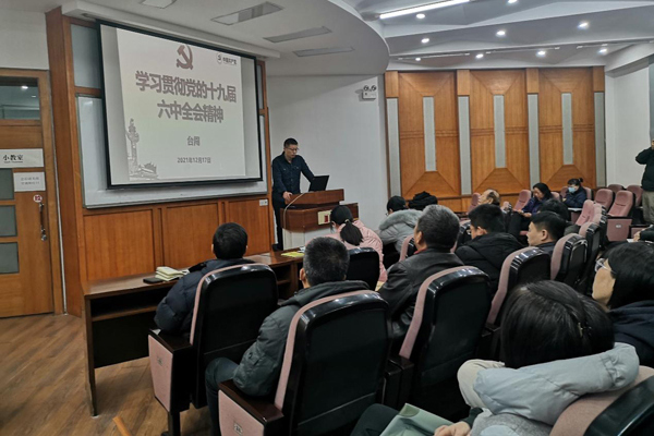 自然环境腐蚀研究部党支部副书记台闯同志作了题为“学习贯彻党的十九届六中全会精神”专题党课报告。他带领大家从六中全会主要事项、三个决议的内容、百年奋斗重大成就、百年奋斗历史意义、百年奋斗历史经验、新时代中国共产党和数读六中全会公报等几个方面全面领学了党的十九届六中全会精神。号召全体党员要落实党中央决策部署,立足本职岗位,在第二个百年奋斗征程中贡献力量。
