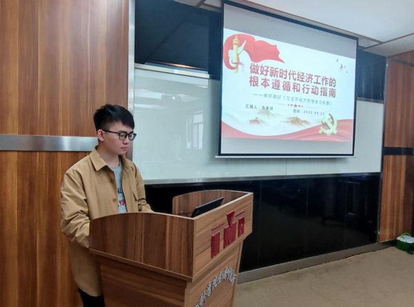 支部宣传委员鲁家铎作了题为“做好新时代经济工作的根本遵循和行动指南——学好用好《习近平经济思想学习纲要》”的主题报告。介绍了习近平经济思想的基本内容,并对构建高质量发展的区域经济布局和实施创新驱动发展战略的内容进行了解读。