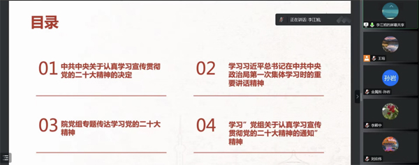 会上,李江旭同志带领大家共同学习了党的二十大精神。与会同志一起原原本本、逐字逐句地学习党的二十大报告内容,深刻领会了党的二十大精神。王培同志表示,近一段时间党支部工作的着力点将聚焦到学习贯彻二十大精神上来,我们要抓住关键,突出重点,做到整体把握,全面系统学习领会。我们党支部将开展主题教育等多种形式的培训,组织支部党员认真学习二十大精神。支部各个党学习小组要充分发挥作用,认真组织大家学习二十大精神相关辅导材料,同时也要扎实推进党员干部讲党课活动。
