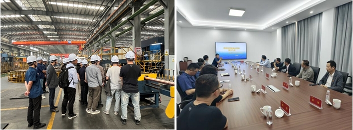 常州润来科技有限公司拥有8条生产线、年产30万吨精密铜管的加工能力,其单线生产能力、工艺水平、设备性能和智能化程度均处于行业领先水平,已成为格力、美的、海尔等企业的核心供应商。参观过程中,公司负责人介绍了铜管产品的生产流程及双方共建的“高质量精密铜材智能制造协同创新中心”的运行情况。在交流环节,研究人员就材料短流程制备工艺、在线表征技术的开发、材料除氢等技术细节展开了研讨。