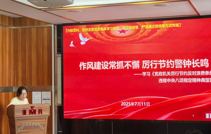会上,魏薇首先作了题为“作风建设常抓不懈 厉行节约警钟长鸣”的主题报告,带领大家系统学习了《党政机关厉行节约发对浪费条例》,并通报学习了中央层面违规吃喝典型案例和中国科学院违反中央八项规定精神典型案例。教育支部党员厉行勤俭节约、反对铺张浪费,不断强化纪律意识,涵养自律修为,用党的纪律校正思想和行动,在遵规守纪的基础上凝心聚力、干事创业。