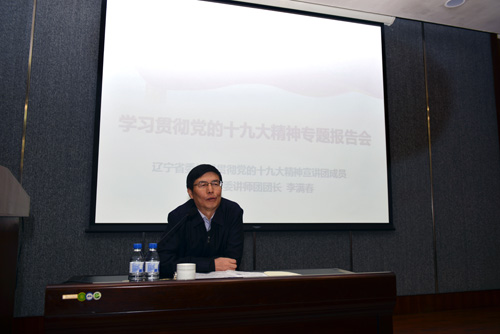 11月17日下午,我所举办学习贯彻党的十九大精神专题报告会,邀请辽宁省委学习贯彻党的十九大精神宣讲团成员、辽宁省委讲师团团长李满春作了题为“深入学习贯彻党的十九大精神,不忘初心 牢记使命 永远奋斗”专题报告。所领导,党委委员,纪委委员,副处级以上领导干部,民主党派、无党派人士代表,职工、研究生党员300余人参加了会议。会议由党办主任黄粮主持。 李满春全面回顾了十九大盛况,并从深刻领会习近平新时代中国特色社会主义思想、深刻领会中国特色社会主义进入新时代、深刻领会我国社会主要矛盾变化、深刻领会全面从严治党等八个方面进行了解读,系统阐述了我国取得的新风貌、新能量、新精神、新前景、新气象,全面介绍了党的十九大主题和重要成果,深入解读了党的十九大提出的新判断、新思想、新要求、新部署。 学习宣传贯彻党的十九大精神,是我所当前和今后一个时期首要的政治任务。后续所党委将继续开展多形式、分层次、全覆盖的学习培训,通过报告会、座谈会、研讨会等多种形式,组织广大党员群众认真学习领会十九大精神。