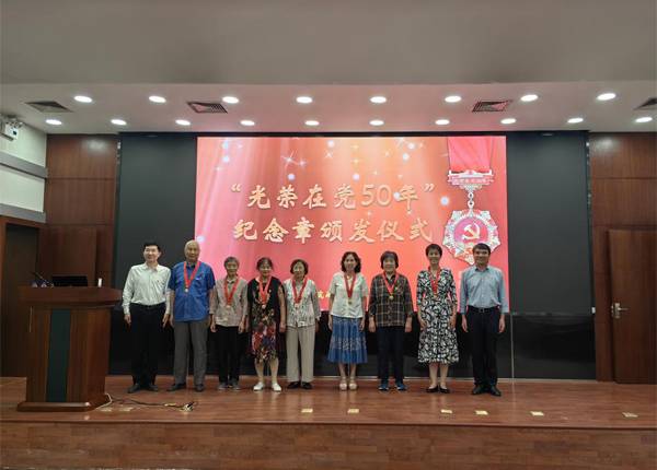 陈星秋同志为党员代表颁发“光荣在党50年”纪念章