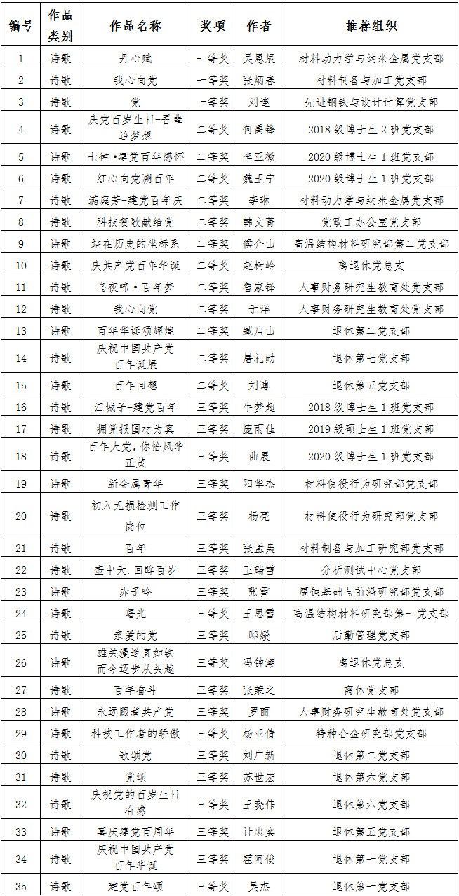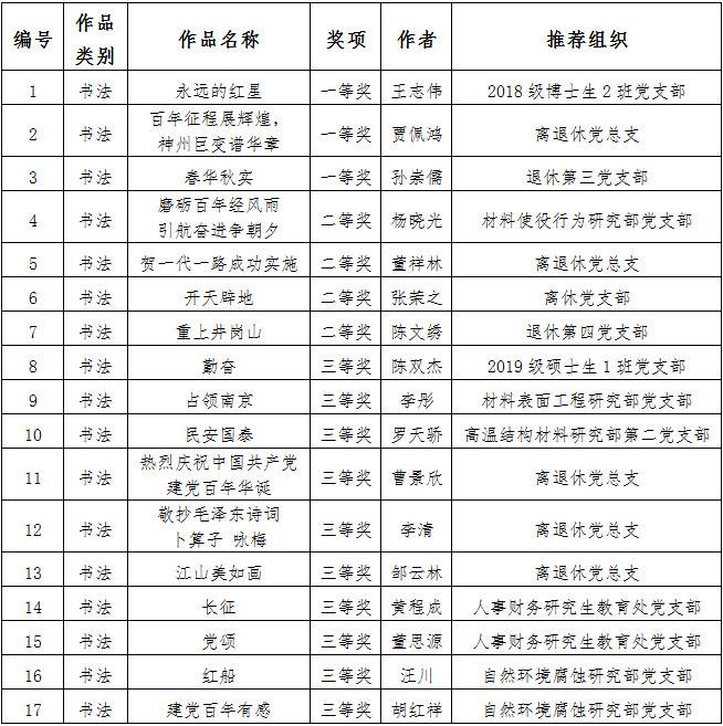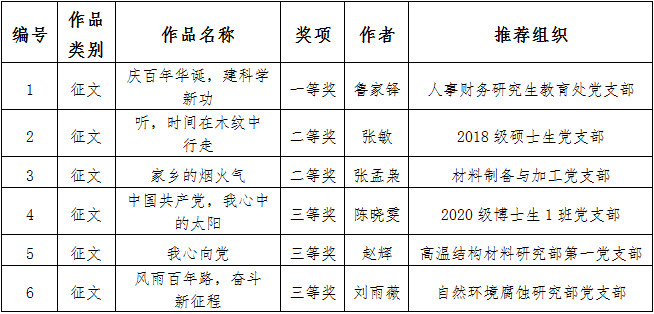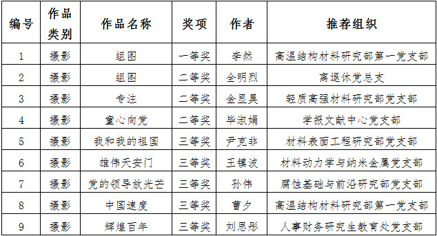 熠熠党心跃百年,翰墨光影颂华章。为庆祝建党100周年,深入学习贯彻习近平新时代中国特色社会主义思想,按照中国科学院的统一部署,所党委组织全所广大职工、研究生以“科学梦 建新功——我心向党”为主题,开展了庆祝中国共产党成立100周年诗、文、书、画、摄影作品征集、评选与展示活动。 本次活动历时一个半月,得到了全所广大在职职工、离退休职工和研究生的积极响应。各党支部、分工会积极组织征集反映中科院科技报国、创新为民辉煌历程和耀彩网人精神风貌的作品。活动共计征集到各类作品445件。其中,诗歌作品67篇、征文作品11篇、书法作品33幅、绘画作品17幅、摄影作品317件。 经过评审,各类作品共评选出一等奖9个、二等奖25个、三等奖42个、参与奖101个。12个党支部获得优秀组织奖。 部分获奖作品整理后,近期将在所网站“庆祝建党百年专栏”中进行集中展示。 作品获奖名单