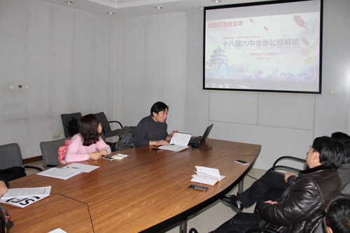 11月11日,后勤机关党支部组织支部全体党员学习党的十八届六中全会精神,会议由支部书记张达同志主持。
