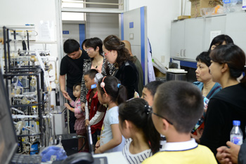 在表面分析设备前,实验室的叔叔耐心地给小朋友们讲解,如何利用这个装满了长枪短炮的“大家伙”看材料的微观世界。听了实验室叔叔的讲解,小朋友们都按捺不住激动的心情,兴奋地想冲上去摸一摸。