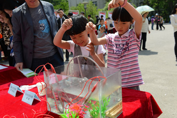 “叔叔,这个弹簧为什么会变形?”,在“形状记忆合金展区”,看到由形状记忆合金做成的弹簧在热水中恢复原形,大人小孩的好奇心顿时爆棚,都迫不及待地要一显身手。