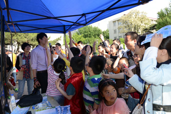 在科学常识有奖问答环节,小朋友们将主持人团团围住,争先恐后抢答问题。