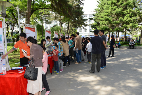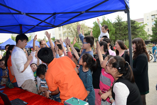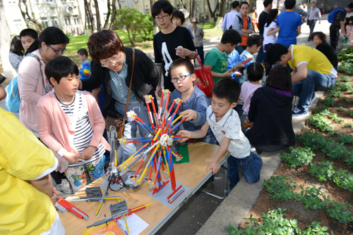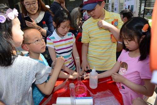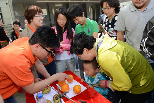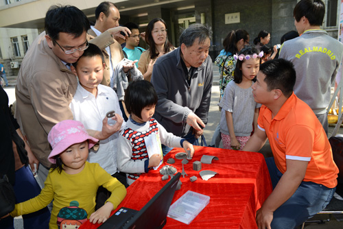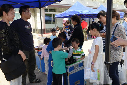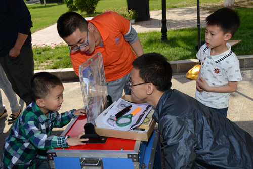 “科普大篷车”是今年家属日活动的另一个新看点。辽宁省科技馆的“爸爸的鼻子”、“大象穿鼠洞”、“椎体上滚”、“奇异的翻转环”、“木琴”等16个涉及光学、物理、声学等科学原理的科普展品受邀参与了家属日活动,这些从科技馆走出的展品充满了趣味性和操作性,大家在玩的过程中学到了许多知识。