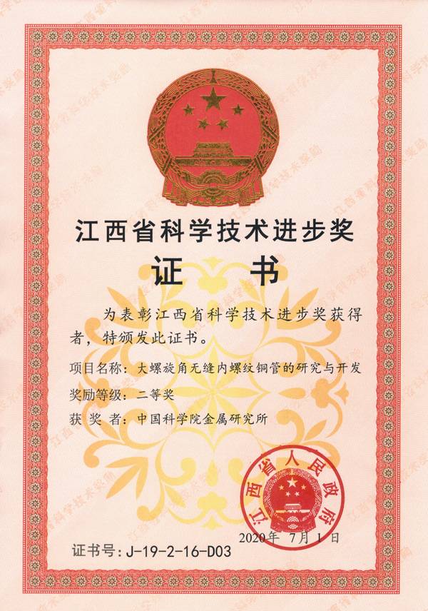 | “大螺旋角无缝内螺纹铜管的研究与开发”获得江西省科技进步二等奖 |