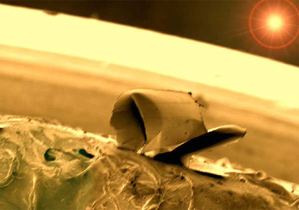 偶得于石墨烯薄膜样品的扫描电镜照片。石墨烯薄膜具有非常好的耐弯折性能,由于样品制备中的种种巧合,使得薄膜连续弯折两次,在保持非常小的弯曲曲率下,仍然没有破裂,从而形成了蜗牛的形状。蜗牛是慢的代言人,相信如果蜗牛是用超轻的石墨烯做成,高弹性模量,高柔性的石墨烯通过弯曲,恢复,弯曲,恢复这样往复的方式前进,那么蜗牛应该爬得很快吧!