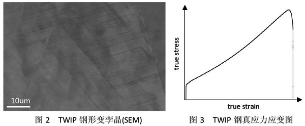 从1888年到20世纪50年代,经历了70多年漫长的发展,科学家和工程师对高锰钢的研究并没有结束,在1997年Grassel等人在研究Fe-Mn-Si-Al系TRIP钢时发现,当锰含量达到25%,Al和Si含量在3%时,其抗拉强度和延伸率的乘积在50000Mpa%以上,是传统TRIP钢的两倍[2],此新钢种力学性能已远超TRIP钢。随后的研究发现该类合金的高强韧性主要归功于在变形过程中,产生了形变孪晶,这些细小的形变孪晶(宽度在nm级别)见图2所示相互交叉,表现出了动态Hall-Petch关系,并阻止了基体中位错的滑移,在提高了基体的抗拉强度的同时,推迟了基体颈缩的发生,使得变形能够均匀发生,从而提高了其塑性变形能力,表现出如图3所示的连续加工硬化能力。同时由于没有TRIP效应发生,即没有形变诱发马氏体相变,因此该钢种良好的塑性性能并没有被马氏体所破坏。所以总体上TWIP(twinning induced plasticity)钢表现出了比TRIP钢还要突出的强韧化能力。