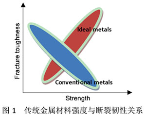 由于全球暖化以及石油等矿物能源的急剧消耗,节能减排成为了一项急需完成的课题。其中,汽车行业便首当其冲,据统计[1],汽车重量每减轻10%,燃料消耗可降低3~7%。由此看来,在保证车身强度的前提下,减轻汽车重量,是完成节能减排问题的有效手段之一。高强度汽车用钢由于其强度高,在保证强度的前提下,能减轻整体结构件的重量。因此,其渐渐地在汽车制造行业中崭露头角。但是在金属材料中,常常存在着强度和塑性的倒置关系,关系如图1所示。为此,我们需要找到一种有效的强韧化手段来保证金属材料在具有高强度的同时又具备一定的塑性加工能力。