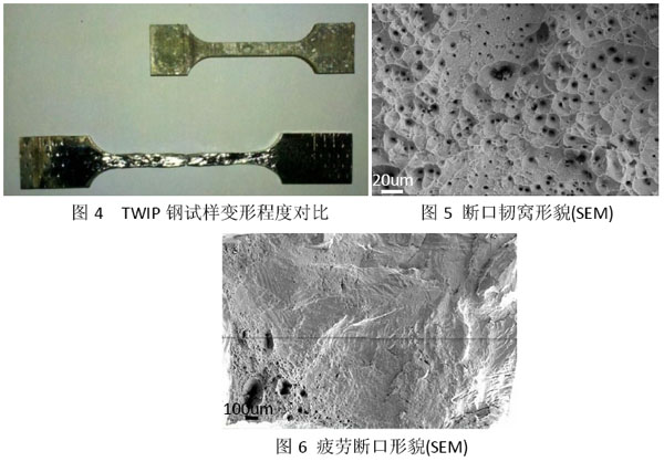 由于TWIP钢屈服强度在200~500Mpa,抗拉强度基本在500~1600Mpa之间,其疲劳极限(试样经无限次应力循环,一般大于107周次,也不发生疲劳断裂,故将对应的应力称为疲劳极限)高于屈服强度,其疲劳断口形貌见图6所示;一般情况下延伸率在30~60%之间[2],甚至可以达到80%以上,原始试样与拉伸试样的对比见图4所示;通过扫描电镜(SEM-SE2)观察,可以看到断口表现出明显韧窝形貌,表明TWIP钢呈现韧性断裂特征,其断裂表面形貌见图5所示。