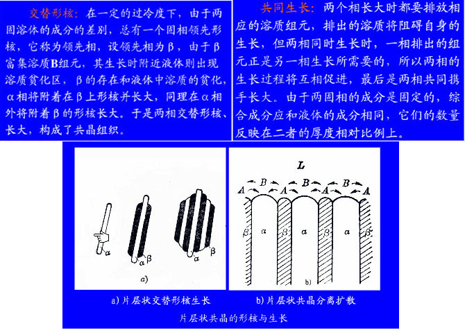 共晶成分合金的结晶是在恒温下进行的,结晶过程从表面开始向中心逐层推进。由于凝固层的内表面比较平滑,对尚未凝固的液态合金流动的阻力小,有利于合金充填型腔。共晶生长过程可以简要概括为交替形核,共同生长。以下给出交替形核及共同生长的具体含义,并附片层状共晶的形核长大示意图。Flash动画展示的是共晶合金形核模拟过程,此动画能够形象直观的描述共晶形核长大过程。