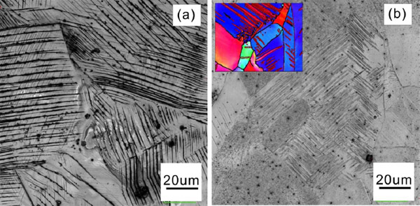 ![]() 图1.TWIP钢拉伸变形后,表面组织观察,(a)滑移带,(b)形变孪晶。