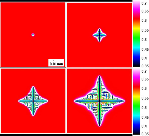 | 图中显示了计算机模拟的不同时刻的凝固枝晶形貌图,不同的颜色代表不同的浓度分布。这样显微组织形核、生长等过程也将实现“可视化”! |