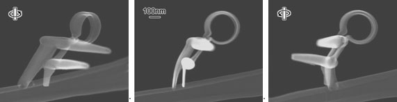 图示 电子束一次扫描制备的纳米人偶(Nano-doll)三维结构 实验参数: 电镜设备:JEM-2500 STEM 沉积气氛:W(CO)6 使用基板:C porous film 加速电压:200kV 环境气压:3~4*10-5Pa 拍摄倍率:*200,000 |