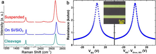 ![]() 图4 六边形单晶石墨烯的拉曼光谱及其电输运特性