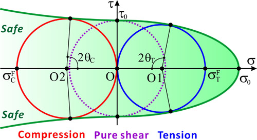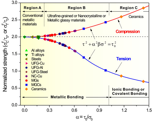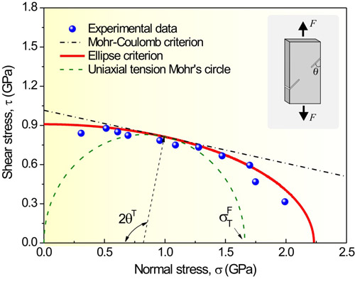 1638年,伽利略在其名著《两门新科学》中首次对材料破坏需要满足的应力条件进行了讨论,并提出了著名的最大正应力准则。自此之后,新的材料屈服与断裂准则不断被提出,其中最著名的有屈特加准则(1864年提出,或称为最大切应力准则)、范×米塞斯准则(1913年)及莫尔-库仑准则(1773年,1900年)等。20世纪60年代,人们成功地制备出金属玻璃条带,随后在80年代末制备出块体金属玻璃材料。金属玻璃具有极高的屈服强度和断裂强度(可达~5 GPa),自其问世以来便引起了人们的广泛关注。对金属玻璃断裂规律的探索,特别是对其断裂行为与应力条件关系的研究一直是金属玻璃领域研究的重要问题。 室温下,金属玻璃的拉伸与压缩断裂常常表现为脆性的剪切断裂。最初,人们发现这种剪切断裂主要沿最大切应力面(与加载轴成45°)发生,这表明剪切面上正应力对金属玻璃的断裂行为无影响,因此可用屈特加准则描述其断裂行为。1989年,英国剑桥大学Donovan博士的研究表明Pd基金属玻璃的压缩剪切断裂角为42°,据此提出其断裂行为应遵循能反映正应力作用的莫尔-库仑准则。1998年,美国橡树岭国家实验室刘锦川教授通过对Zr基金属玻璃的拉伸和压缩实验,发现拉伸剪切断裂角为53°-60°,而压缩剪切断裂角仍为45°,这表明正应力只影响金属玻璃的拉伸断裂行为,而不影响压缩断裂行为。因此,金属玻璃断裂准则问题的研究首先需要澄清剪切面上正应力是否影响其剪切断裂行为。 2002年正在德国做洪堡学者的张哲峰博士对这一重要问题产生了浓厚兴趣,他设计了同一成分Zr基金属玻璃样品,并进行了拉伸和压缩对比实验,发现该Zr基金属玻璃的压缩剪切断裂角为43°,而拉伸剪切断裂角为54°,并且压缩强度略大于拉伸强度。结合拉伸与压缩剪切断裂表面形貌的明显差别,张哲峰博士明确提出:剪切面上拉伸正应力对金属玻璃剪切断裂起促进作用,而压缩正应力对剪切断裂起抑制作用,这样就合理地解释了金属玻璃拉伸与压缩强度的不对称性、剪切断裂角的不一致性和断裂表面形貌的差别,这从实验上首次明确了剪切面上正应力对金属玻璃拉伸与压缩剪切断裂行为都具有重要影响,该研究结果发表在Acta Mater. 51 (2003) 1167-1179上。在此基础上,他进一步研究和总结了Zr、Cu、Ni、Fe、Pd、Co和Ti基等不同金属玻璃及其复合材料的断裂规律,发现大多数单相金属玻璃的压缩剪切断裂角略小于45°,而陶瓷粒子、纳米晶或枝晶增强金属玻璃复合材料的压缩剪切断裂角远小于45°;在拉伸载荷作用下,剪切断裂角通常为50°-65°,或者发生拉伸正断,这进一步证实了剪切面上正应力对金属玻璃等高强度材料剪切断裂规律的重要作用,此项研究结果发表在Phys. Rev. Lett., 91 (2003) 045505。这些结果发表后得到了国际同行的广泛关注,至今两篇论文已被引用560余次。此后,世界各国研究者对更多成分金属玻璃材料的研究结果证实了剪切面上正应力对其断裂行为影响的普遍性。 至此,剪切面上正应力对剪切变形和断裂的重要影响已经澄清,但是如何描述这一正应力效应仍然存在分歧。一种方法是采用传统的莫尔-库仑准则来半定量地对正应力的影响进行描述,该准则也是目前国际上对金属玻璃断裂研究使用较多的准则。如果定量地比较金属玻璃的拉伸与压缩强度及剪切断裂角的差别,就会发现一方面采用莫尔-库仑准则所预测的拉伸/压缩强度不对称性过大;另一方面该准则预测的拉伸/压缩剪切断裂角度之和恒为90°,这些都与实验事实明显不符。2005年,张哲峰研究员同时考虑剪切面上正应力和切应力对材料断裂的影响,并结合不同材料的性质,提出了新的统一拉伸断裂准则——椭圆准则,该准则不仅可以定量地描述各种金属玻璃材料拉伸断裂行为以及剪切与拉伸正断的转变,还从一个新的角度揭示了不同类型金属材料的强度差别与剪切变形机制。此外,该准则通过提出的新参数α——断裂方式因子的变化,将上述四个经典断裂与强度准则(最大正应力准则、屈特加准则、范×米塞斯准则和莫尔-库仑准则)有机地统一起来,这为材料的强度与断裂理论家族提供了新的判据。此项研究结果发表在Phys. Rev. Lett., 94 (2005) 094301。 2010年,张哲峰研究员与其博士研究生屈瑞涛在Zr基金属玻璃拉伸试样中引入了一系列不同角度倾斜缺口,控制剪切断裂沿不同角度面发生,在断裂瞬间不同剪切面具有不同的正应力与切应力组合,系统地研究了正应力对拉伸断裂行为的影响。基于对多种金属玻璃拉伸强度数据和断裂行为的理论分析,他们发现:相对于莫尔-库仑准则,椭圆准则能更加精确地定量描述正应力对金属玻璃拉伸强度与断裂行为的作用(图1),也能合理地解释前人在研究中所观察到的各种金属玻璃材料的拉伸断裂行为。该研究结果从实验上确定了椭圆准则的有效性,并证实椭圆准则可以作为金属玻璃材料的本征拉伸断裂准则。此项研究结果发表在J. Appl. Phys. 109 (2011) 083544。 金属玻璃在拉伸载荷下的断裂行为可用椭圆准则进行很好地预测,那么其压缩断裂行为该如何描述?在复杂应力状态下的断裂行为又该如何预测?最近,张哲峰研究员与屈瑞涛博士考察了大量金属玻璃材料的拉伸、压缩以及纯剪切断裂行为,提出金属玻璃材料断裂的三个重要事实:(I) 拉伸与压缩断裂强度存在一定的不对称性;(II) 拉伸与压缩断裂角均偏离45°;(III) 纯剪切