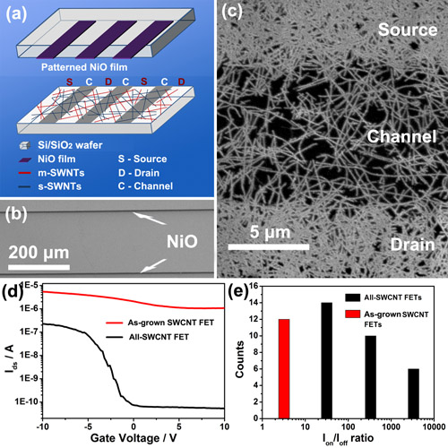 单壁碳纳米管因直径和手性角等结构特征不同可表现为金属性或半导体性。为构建基于单壁碳纳米管的高性能场效应晶体管等电子器件及其集成电路,需获得单一导电属性的单壁碳纳米管,而通常制备得到的碳纳米管是金属性和半导体性碳管的混合物。因此,单壁碳纳米管的结构可控制备是当前碳纳米管研究的重点和难点之一。 耀彩网沈阳材料科学国家(联合)实验室先进炭材料研究部的研究人员最近采取两条路线开展单壁碳纳米管的可控制备研究。其一是利用金属性单壁碳纳米管反应活性较高的特点,引入刻蚀剂将其选择性去除,从而获得半导体单壁碳纳米管。他们提出了氧辅助浮动催化剂化学气相沉积法,在碳纳米管的生长过程中加入适量氧气,原位刻蚀金属性碳纳米管,从而宏量制备出半导体性单壁碳纳米管含量为90%的样品,并构建了薄膜场效应晶体管,发现其开关比较普通单壁碳纳米管构建的器件高出3-4个数量级。进而又提出了碳热还原方法在较低温度下(350℃)选择性去除金属性单壁碳纳米管,并构建出全单壁碳纳米管场效应晶体管。他们首先利用光刻在Si/SiOx基体上沉积Ni后预氧化成NiO条带(图1a-b),然后将其覆盖在碳纳米管薄膜上在350℃下进行碳热反应。与NiO条带接触的金属性单壁碳纳米管被刻蚀掉,仅留下半导体性单壁碳纳米管,其可作为场效应晶体管的沟道材料;而未与NiO条带接触的碳纳米管保持结构完整,可作为源、漏电极。从图1c可以看出原始单壁碳纳米管网络的密度较高,而在沟道区域单壁碳纳米管的密度明显减小。对于普通单壁碳纳米管构建的场效应晶体管,由于其中的金属性单壁碳纳米管连通源、漏电极,无法通过栅压调节完全关断,器件的开关比仅为2左右。而全单壁碳纳米管场效应晶体管中的沟道材料为半导体性单壁碳纳米管,其电流的开关比高达103-104(图1e)。该全碳纳米管场效应晶体管还可望用于柔性器件和电路的构建。部分研究结果发表于Journal of the American Chemical Society (2011, 133: 5232-5235)和ACS Nano (2012, 6: 9657-9661). 第二条路线是设计和寻找新型催化剂,直接生长具有特定结构的单壁碳纳米管。通常用于制备碳纳米管的催化剂是过渡金属纳米颗粒,其在生长过程中呈液态或半液态,通过碳的溶解-析出、遵循气-液-固机制生长碳纳米管。过渡金属催化剂具有催化活性高的优点,但在高温下稳定性差,形貌和结构不可控,不利于碳纳米管的结构控制。为此,耀彩网研究人员将一种氮化硼纳米纤维(BNNF)作为生长单壁碳纳米管的催化剂。该BNNF的(002)面垂直于纤维的轴向,通过等离子刻蚀等方法可在其边缘形成未闭合的(002)片层(图2a-b)。在化学气相沉积生长过程中,单壁碳纳米管可从该活性位形核生长(图2c-d)。因为BN具有良好的高温稳定性,在碳纳米管生长过程中可保持结构不发生改变,这为单壁碳纳米管的结构控制提供了可能。实验结果表明从该BNNF生长出单壁碳纳米管的直径呈台阶状分布,约是六方BN层间距的整数倍(图2e)。第一原理计算表明,碳纳米管从未闭合的(002)层间生长有利于体系能量的降低。研究人员在透射电镜下原位研究了碳纳米管从BNNF生长的过程,藉此提出了单壁碳纳米管可通过异质外延从具有特定结构的“种籽”上生长。该研究为单壁碳纳米管的结构控制生长提供了新的思路。部分结果于2012年12月13日在Scientific Reports (2012, 2: 971) 在线发表。 以上工作得到了国家自然科学基金委和科技部纳米科技重大研究计划项目的资助。![]() 图1 (a)碳热还原法制备半导体性单壁碳纳米管及构建全碳纳米管场效应晶体管的示意图。(b)厚度约为100纳米、宽度为10微米的NiO条带。(c)碳热还原反应后获得的全碳纳米管晶体管的源、漏极和沟道。(d)所构建场效应晶体管的输运特性对比。(e)所构建场效应晶体管的开关比统计分布。 ![]() 图2 (a-b)氮化硼纳米纤维“种籽”的透射电镜照片。(c-d)氮化硼纳米纤维生长出的单壁碳纳米管的扫描电镜和透射电镜照片。(e)氮化硼纳米纤维生长的单壁碳纳米管的直径统计分布。 |