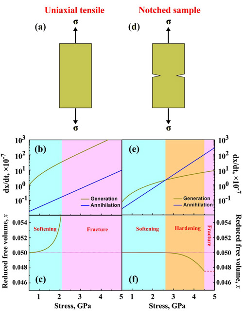 图1:拉伸条件下自由体积的产生/湮灭速率与应力状态的关系。(a-c)在单轴拉伸条件下,自由体积的产生永远大于湮灭速率,从而出现软化形象;(d-f) 在三维应力状态下,存在临界应力,当大于此值时,自由体积的湮灭占主导地位,从而出现“加工硬化现象”
