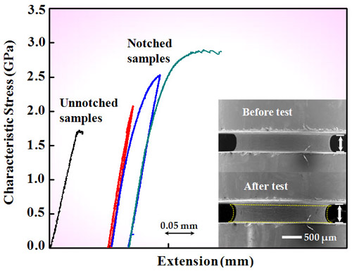 图2:含缺口的Zr基非晶合金拉伸应力-应变曲线及变形前后的SEM形貌