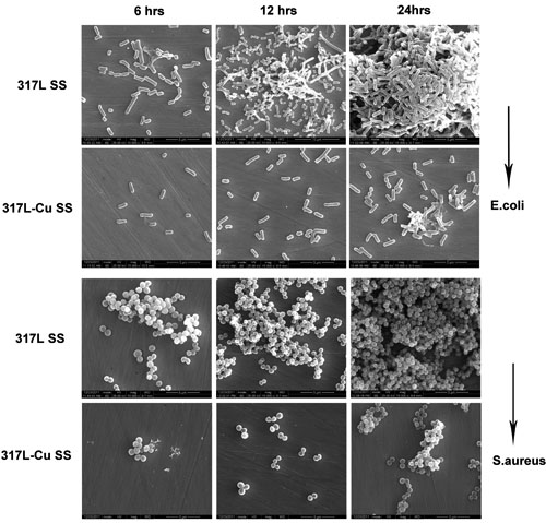 医用金属材料以其高强韧性、耐疲劳、易加工成形性等优良的综合性能,一直是临床上用量最大和应用广泛的一类生物医用材料。医用金属材料是需要承受较高载荷的骨、齿等硬组织以及介入治疗支架的首选植入材料,已大量应用于骨科、齿科、介入治疗等重要医疗领域中的各类植入医疗器械。目前医用金属材料中用量最大、应用范围最广的是不锈钢、钛及钛合金、钴基合金三大类材料,在医用金属材料的生产和临床应用中占有举足轻重的地位。此外还有镍钛形状记忆合金以及金、银、钽、铌、锆等贵金属。 然而,目前临床应用的医用金属材料在生物体中一般表现为生物惰性,不具备生物活性,因此往往需要通过对其进行表面改性,来达到其具备一定生物活性,进而提高其临床使用性能的目的。那么能否使医用金属材料自身就具备某种生物活性呢?至今还未有这方面的研究报道。医用金属材料的生物功能化就是希望解决这一重要问题,因而它是一个具有创新意义和挑战性的新概念,其核心思想就是使医用金属材料在发挥其自身优异力学性能的同时,同时还具备特定的生物医学功能,从而达到更佳的临床医疗效果。杨柯领导的生物材料研究团队近年来进行了多方面的有意义尝试,已经初步实现了特定医用金属材料的生物功能化,并将这一新思想发表在近期的Journal of Materials Science and Technology上(Bio-functional Design for Metal Implants, a New Concept for Development of Metallic Biomaterials, Ling REN, Ke YANG, JMST. 2013, Vol. 29, 1005-1010)。 人们知道,人体中存在有多种不同种类的金属元素,如:宏量金属元素K、Na、Ca、Mg,微量金属元素Fe、Cu、Zn、Mn、Co、Mo、Cr、Sn、V、Ni等,它们在人体中都会发挥不同的生物功能。如果人体中缺失那种金属元素,可能就会引发某种疾病;如果在人体中适量补充某种金属元素,可能会有助于治愈一些疾病。事实上,医用金属材料在人体环境中(无论是体液,还是血液)都会发生不同程度的腐蚀现象,从不锈钢、钛及钛合金、钴基合金等金属材料的极缓慢腐蚀,到目前热点研究的镁基金属的快速腐蚀直至完全降解吸收。因此就可以利用医用金属材料在人体环境中不可避免发生腐蚀的特性,通过特定的合金化设计和制备,在现有医用金属材料中添加某种具有生物医学功能的特定金属元素,利用金属在体内发生腐蚀而造成的这种特定金属元素的持续释放现象,在满足生物安全性的前提下,在实现植入金属力学支撑作用的同时,额外发挥这一特定金属元素的生物医学功能,从而赋予医用金属材料特定的结构/生物医学功能一体化特性。这是一个极富挑战性的创新设想,具有重要的临床应用价值,国际上还未见有人提出相同的思想及相关的研究报道!实现医用金属材料的结构/生物医学功能一体化的关键在于针对临床应用目标的材料设计、制备及性能调控,其应在保持现有同类医用金属材料各项性能水平的基础上,通过特定金属元素的持续溶出,而达到兼有力学承载能力和生物医学功能的双重目的。 在众多金属元素中,铜的生物学作用逐渐得到人们的认可。铜离子是人体中必需的微量金属元素,它的杀菌作用很早就被广泛认可。铜离子对心血管系统具有重要的作用,不仅可以抑制血栓的形成,还能抑制动脉平滑肌的过度增殖、变性等病变,并且能够促进血管内皮再生。近期有医学研究表明,无论是在体外还是在动物体内,Cu2SO4溶液中的铜离子均能明显地促进骨胶原的沉积。由于骨胶原能促进钙、磷等无机物质在骨上的沉积,因而能起到修复骨组织、促进骨再生、改善骨质疏松症状等有益作用。此外,还有医学研究发现,微量铜离子可促进人体组织中的血管化过程,这对人体组织的修复过程具有至关重要的作用。 杨柯领导的研究团队近年来研究开发出的系列含铜抗菌不锈钢为上述尝试奠定了材料基础。所谓含铜不锈钢,是指在现有医用不锈钢(304、316L、317L等)的成分基础上,通过加入适度过饱和量的铜元素,经过固溶+时效的热处理,使其基体中均匀弥散地分布有纳米尺度富铜析出相的新型不锈钢。这种含有富铜相的含铜不锈钢在人体环境中由于不可避免地会发生一定的腐蚀,因而可以微量和持续地向周围组织中释放出铜离子,从而发挥出铜离子的诸多有益的生物医学功能。因此,含铜不锈钢巧妙地将不锈钢的优异的力学性能、耐蚀能力与铜离子的生物医学功能相结合。根据医用金属材料生物功能化这一全新的概念,研究团队开展了含铜不锈钢(316L-Cu和317L-Cu)抑制细菌感染、降低支架内再狭窄、促进成骨等生物医学功能的研究探索工作。 图1分别为利用扫描电镜对大肠杆菌和金黄色葡萄球菌在骨科植入常用的317L不锈钢和317L-Cu含铜不锈钢表面上的细菌生物膜形成过程的观察结果。图中大肠杆菌呈杆状,金黄色葡萄球菌呈球状。从图2中可以看到,317L不锈钢的表面上粘附有大量的细菌,并且随着与细菌共培养时间的增加,细菌数量越来越多,形成的细菌生物膜面积和厚度越来越大。当时间达到24h时,可以看到317L不锈钢表面上形成的细菌生物膜已经呈现多层立体结构。然而,317L-Cu不锈钢表面上的细菌数量非常稀少,其随意和零星地分布在不锈钢表面上,而且即使增加与细菌的共培养时间,也没有发现形成细菌生物膜。由此可见,由于含铜不锈钢具有的强烈和广谱杀菌功能,因此能够有效抑