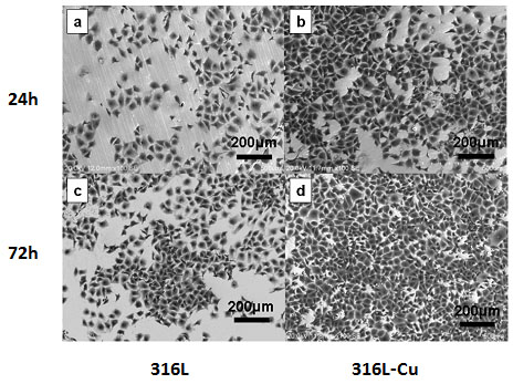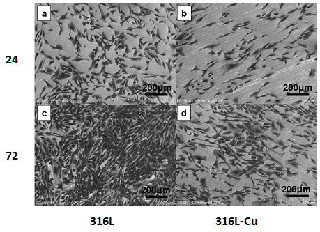 图1 317L不锈钢和317L-Cu不锈钢分别与大肠杆菌(E. coli)和金黄色普通球菌(S. aureus)共培养6、12、24小时后,表面形成细菌生物膜的SEM形貌观察。 心血管支架植入是目前治疗冠脉狭窄的一种有效方法,已经得到广泛的临床应用。然而支架植入后引发的冠脉再狭窄现象(称为支架内再狭窄,in-stent restenosis - ISR)是目前临床上亟待解决的重要问题。虽然近年来临床应用的带药支架能够部分地降低ISR的发生率,但其造成的远期再狭窄又是一个新的临床问题。临床研究表明,支架植入后引发的急性血栓以及血管平滑肌的过度增生是ISR发生的二个主要原因,而加快血管内皮化会降低急性血栓的发生。已有医学研究报道,微量铜离子既可降低凝血倾向,有利于抑制血栓形成,又能抑制血管平滑肌细胞(VSMC)的增殖,但促进血管内皮细胞(VEC)的增殖,从而有利于血管的内皮化过程。铜元素的这些影响都会有助于降低ISR的发生率。 316L不锈钢已广泛用于制造心血管支架,如果在316L不锈钢中添加适量铜,而使其在血液环境中微量和持续地释放铜离子,从而发挥铜离子对心血管系统的上述诸多有益作用,就可能从心血管支架用材料方面达到有效降低ISR发生率的目的,这是医用金属材料生物功能化的又一项有意义的尝试。研究团队完成的大量和不同内容(细胞粘附、细胞凋亡、细胞迁移等)的体外研究结果都给予了有利的验证,例如:与316L不锈钢相比,VSMC在316L-Cu含铜不锈钢表面上的粘附量明显降低(见图2(a)),在316L-Cu不锈钢浸提液中的凋亡率增大、迁移能力明显下降,表明含铜不锈钢中的微量铜离子释放具有抑制血管平滑肌的过度增生的生物功能。而与此同时,316L-Cu不锈钢却有助于VEC的增殖(见图2(b)),提高细胞的迁移能力,从而会加快血管的内皮化过程。血小板粘附、动态凝血等实验结果表明,316L-Cu不锈钢具有更优异的抗凝血性能,从而会有利于降低血栓形成倾向。以上体外实验研究结果表明,316L-Cu不锈钢应自身具有降低ISR发生率的生物医学功能,有望成为心血管支架用新一代不锈钢植入材料。目前研究团队已经加工出316L-Cu不锈钢心血管支架,与临床医院合作,正在进行相关的动物植入实验研究。相关研究成果已经申报国家发明专利,并发表在Journal of Materials Science: Materials in Medicine上。