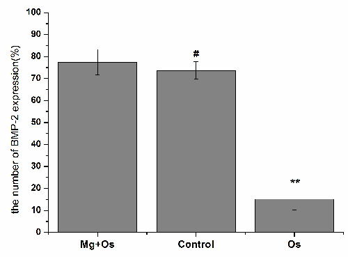 图3 不同实验组的BMP-2表达,Mg+Os = 在骨质疏松模型大鼠中植入镁合金4周,Control = 正常大鼠对照,Os = 骨质疏松模型大鼠