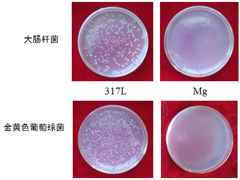 图4 317L不锈钢和纯镁分别与大肠杆菌、金黄色葡萄球菌共培养后的杀菌效果照片 |