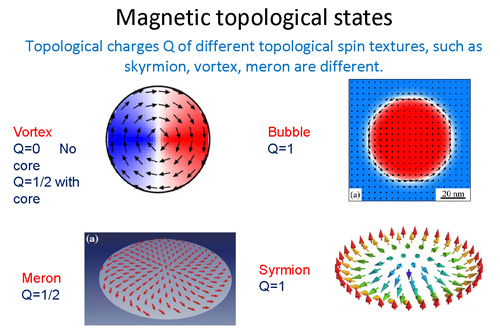 拓扑学与代数、几何一样是一门基础性的学科。拓扑学是近代发展起来的一个研究连续性现象的数学分支。主要研究拓扑空间在拓扑变换下的不变性质和不变量。拓扑结构的例子有不同的纽结(knots)以及链圈(links),还有莫比乌斯带等。最近的研究显示,拓扑学与材料物理、材料性能的联系越来越紧密。可以说,拓扑学的概念正在应用于越来越多的学科领域。在越来越多的材料中发现拓扑学的贡献。特别是量子力学中波函数的拓扑相因子与许多著名的物理现象相联系。例如:Aharonov-Bohm效应、Berry相效应、Josephson效应、量子霍尔效应、de Haas-van Alphen效应等均与拓扑学密切相关。所以,拓扑学也发展成为联系许多学科方向的纽带,促进了学科交叉和各学科的发展。深入研究金属磁性材料的拓扑结构与磁性、电磁性能的关系,不但可以深入理解拓扑结构对材料物理性质的贡献,还可以通过调控材料的拓扑结构来改进材料的磁性和电磁性能,并在深层次理解拓扑结构的贡献。 材料学与拓扑学交叉的一个研究方向是,通过对自旋组态以及(磁性或铁电)磁畴的观察分析自旋组态以及磁畴结构的拓扑学因素。最近,在磁性材料中的自旋拓扑结构(包括vortex, skyrmion, meron等组态),特别是斯格米子(skyrmion)态,引起学术界的广泛关注。斯格米子由Tony Skyrme设想出来与重子(baryons)有关的粒子,包括重子与共振态的叠加。这种称为斯格米子的准粒子是非线性sigma模型的一个非平庸经典解,是一种拓扑孤立子。人们发现在不同的领域(包括在经典液体、液晶、玻色-爱因斯坦凝聚、量子霍尔磁体)存在斯格米子。例如,在量子霍尔磁体中,在填充因子n=1处,即使在塞曼能为零的极限条件下,电子之间的交换相互作用也会导致电子自旋的完全极化,所有电子均处于最低的自旋劈裂的朗道能级上,其自旋都与磁场平行排列。在单粒子图像中,继续添加的一个电子将出现在下一个自旋劈裂的朗道能级上。而相互作用的二维系统通过形成斯格米子在两个能级上安置电子来降低交换作用。这是因为形成斯格米子所需的能量大约是翻转单独一个电子自旋所需要的交换相互作用增强的塞曼能的一半。这类自旋组态仍然带有一个单位的电子电荷,但可以涉及多于一个电子的自旋翻转。 vortex, skyrmion, meron等组态可以通过拓扑不变量的计算来区分,如下图所示: