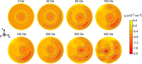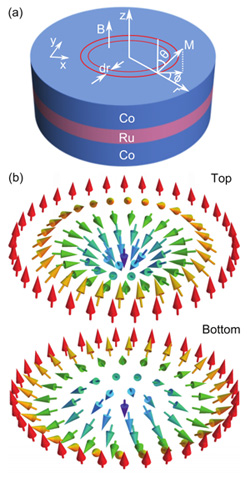 以前的理论预言在具有Dzyaloshinsky-Moriya(DM)相互作用的磁体中能形成稳定的斯格米子基态。最近,许多实验表明,斯格米子存在于螺旋形的磁体MnSi和 FeCoSi。当然,在螺旋磁体中发生的斯格米子通常是在低温下由一个外磁场诱导的, 限制了它在自旋电子学上可能的应用。为了解决这个问题,人们做出了大量的努力。但是存在于螺旋磁体中的斯格米子自旋组态总是与手性(所谓的DM)磁性相互作用相联系。DM相互作用倾向于使自旋形成锥角结构以及非常规的磁性织构,如螺旋或斯格米子。当然,尽管有以上这些努力,仍然没有在室温及高于室温的自发斯格米子磁性基态的报道,也没有发现在不具有DM相互作用的磁体中出现斯格米子的报道。沈阳材料科学国家(联合)实验室磁性材料与磁学研究部研究人员注意到静磁能也倾向于自旋倾斜来减少系统的总能量。例如,磁性薄膜材料可以展示不同的拓扑自旋织构(如涡旋态和meron态)。他们利用微磁学研究发现,交换能、磁晶各向异性能和退磁能的竞争可以在没有DM相互作用Co/Ru/Co 纳米薄膜盘中在室温产生自发斯格米子,并且在沿+ z方向外加0.44 T的磁场下斯格米子仍然稳定。发现纳米薄膜盘中的斯格米子具有新奇的动力学行为。用拓扑态密度的矩定义斯格米子的引导中心(Rx ,Ry)在加一个脉冲磁场后表现一个星状动力学轨迹,去除磁场后表现为一个六角的动力学轨迹。斯格米子的动力学行为与涡旋和磁泡的不同。由于存在上下纳米盘的斯格米子之间的耦合,其中一个斯格米子可以不用外加磁场即可运动。由于强的层间静磁相互作用,它由另外一个耦合着的斯格米子的运动而引导着运动。他们的工作揭示斯格米子可以出现在具有竞争能量的(不限于磁性)体系,揭示了在磁性纳米盘中的自旋组态之间的耦合效应,并极大地丰富拓扑结构的动力学行为,加深了磁性交换耦合对拓扑态密度的影响的理解。相关研究成果发表在Phys. Rev. B88 (2013) 054403。 图1 Co/Ru/Co 纳米薄膜盘中在一些Ru层和Co层厚度下产生自发斯格米子