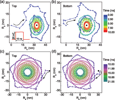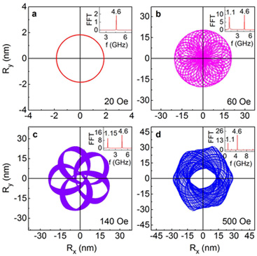 图2 Co/Ru/Co 纳米薄膜盘对上盘加一个脉冲磁场后以及去场后自发斯格米子中心的动力学行为。分别出现星形和椭圆、六边形和圆形的运动轨迹 受限体系中的共振激发引起了人们越来越多的关注,因为它们在微波器件和自旋电子学方面的有着潜在的应用价值。处于共振激发态时,拓扑态的运动轨迹有圆形、椭圆形以及跑道型轨迹。但是更复杂的非线性共振激发行为却很少报道,与之相关的物理机制目前也不清楚。他们研究Co/Ru/Co纳米圆盘体系中耦合skyrmions在单频率微波场下的共振激发行为,发现了skyrmion有着花状动力学行为。通过调节微波场的幅值和频率,能够实现对skyrmion运动的可控调节,使其运动轨迹从圆形转变为多种花状轨迹。这种花状动力学与skyrmion运动时所形成的非局域的拓扑密度分布形变有关,从而激发出1.15 GHz附近的本征频率,导致两种共振模式(顺时针旋转模式和逆时针旋转模式)同时出现,形成花状运动轨迹。这些结果将skyrmion与其他拓扑态的动力学区别开来,并且有利于实际应用中实现对skyrmion的操控。相关工作发表在Scientific Report 4 (2014) 6153。 图3 微波场幅值对skyrmion运动轨迹的影响。(a)-(d)微波场的幅值分别为20、60、140、500 Oe。插图为轨迹相应的FFT图