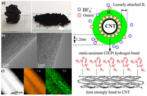 离子液体是一种液态有机盐,是在一定温度范围内由离子组成的有机液体物质。其极性、亲脂性、亲水性、催化活性等性质可以通过阳离子和阴离子的改变而进行调变,因此也常被称为“可设计的溶剂”。离子液体有许多优势特性,例如:在常压下几乎无蒸汽压,在使用、贮藏中不会蒸发散失,可以循环使用,不污染环境;有高的热稳定性和化学稳定性,在较宽广的温度范围内为液态,有利于动力学控制;具有良好的溶解性,它们对无机和有机化合物表现出良好的溶解能力;与一些有机溶剂不互溶,可以提供一个非水、极性可调的两相体系;无可燃性,无着火点等。因此,离子液体在近年来的基础研究过程中受到广泛关注,但因其价格昂贵,分离提纯困难,其大规模的应用仍受到极大限制。 近期,沈阳材料科学国家(联合)实验室催化材料研究部苏党生研究员课题组,基于纳米碳材料与离子液体间特殊的作用力,实现了离子液体与纳米碳的有效结合;并利用真空条件下离子液体的低饱和蒸汽压,对离子液体层数进行有效调控,可实现离子液体在碳材料表面的单层存在,相关成果发表在Chemsuschem(2014, 7, 1542–1546)。这种离子液体与纳米碳的主客体型材料,兼具离子液体和纳米碳的优良性质。在碳催化过程中,增加其有效表面,且使其在液相反应过程中实现无能耗分离。离子液体的固态存在可使其在固相催化中得到应用,并且极大降低离子液体用量,有效提升其利用效率。 研究人员同时发现,在碳表面少层存在的离子液体,可用于分散分子催化剂,实现单分子催化。这种组合可以将均相催化体系非均相于碳材料表面,使新的催化体系同时具有均相催化和非均相催化的优势。反应过程中,离子液体不单可作为催化剂的分散剂和催化反应的反应媒介,还可对催化剂活性位产生电子诱导效应,进而极大提高催化剂的TOF,这对于催化反应意义重大。相关成果发表在Green Chemistry(2014, DOI: 10.1039/C4GC01814A. http://pubs.rsc.org/en/content/articlelanding/2014/gc/c4gc01814a#!divAbstract)鉴于离子液体的可调控性,可选择不同种类的离子液体来适应不同种类的催化剂,使该体系具有很宽的适用范围。 纳米碳材料表面化学惰性较强,使其表面难于调控。但通过离子液体的选择,可得到不同功能化的离子液体表面的碳骨架。在离子液体剥离过程中,研究人员意外发现碳表面对离子液体存在表面限域效应和排列导向作用。利用这两种有趣的效应,可在不同缺陷度表面形成相应的离子液体衍生碳;同时,二者的强相互作用力使得本身无法交联的离子液体产生交联聚合,这消除了离子液体成碳过程中离子液体的选择限制。通过温度调控,可得到不同表面性质,如超亲水或超疏水,酸性或碱性等。相关成果发表在Angew. Chem. Int. Ed.( 2014, DOI: 10.1002/anie.201408201. http://onlinelibrary.wiley.com/doi/10.1002/anie.201408201/abstract)这些可调控的性质,每一种对碳材料的提升都意义重大。同时,通过离子液体的调变,可得到含不同杂原子和官能团的功能化表面,为不同催化过程提供相应活性位,因此具有广泛的适用性。 图1. 左图:a)离子液体/碳纳米管复合胶体与复合材料图像 b,、c)HHT与其相应复合材料的显微图及Mapping图像;右图:复合材料机理图