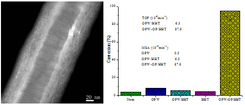 图2. 左图:OPW-OP/HHT复合材料的HAADF-STEM图像;右图:不同催化剂材料在DBT氧化过程中的催化活性