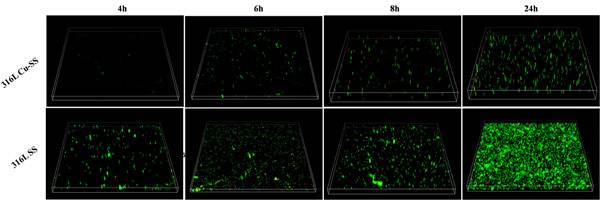 图1 大肠杆菌分别与316L-Cu不锈钢和316L不锈钢共培养4h、6h、8h、24h后,活/死细菌在材料表面粘附情况的激光共聚焦显微镜观察,绿色和红色分别表示活细菌及死细菌