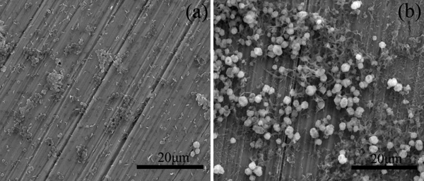 图2 细菌分别与316L-Cu不锈钢(a)和316L不锈钢(b)共培养72h后,材料表面感染性结石形成情况的扫描电镜观察