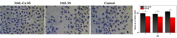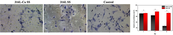 图3尿道上皮细胞与不同材料浸提液共培养24h后,细胞迁移结果,表明316L-Cu不锈钢促进尿道上皮细胞的增殖