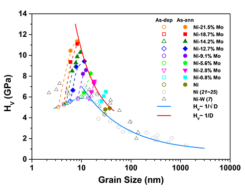 图1. 纳米晶体Ni-Mo合金的软化及硬化行为。制备态(空心)及退火态(实心)样品的显微硬度随晶粒尺寸的变化