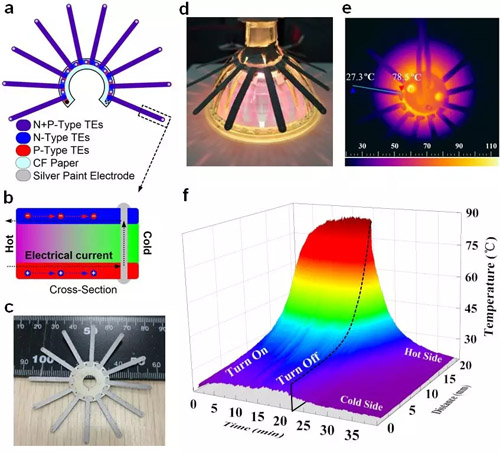 图 柔性热电“发电机”器件结构设计示意图及回收废热发电演示验证