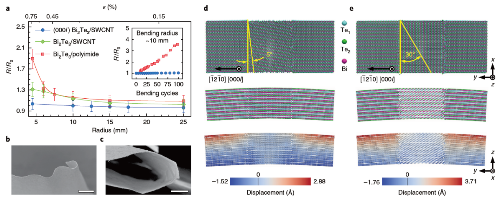 热电材料是一种不需任何外力即可将“热能”与“电能”相互转换的“绿色”能源材料,可利用生活、生产中的废热发电,或在施加偏压条件下实现热量的精准传输,被广泛应用于温差电池供电、微系统芯片控温制冷等领域。传统的热电材料为无机共价键/离子键晶体,例如碲化铋(Bi2Te3)是目前应用最广的热电材料,其周期性层状结构内为共价键/离子键连接,而层间为弱范德华力连接,因而具有本征的脆性,不能发生柔性变形。传统热电材料在实际应用中无法紧密贴合具有复杂曲率变化的热源表面(如热源管道、人体体表等),这种不良热接触导致热量散失和较低的热电转化效率;同时也难以适应热电器件日趋微型化和高度集成化发展的需要。因此,高性能柔性热电材料的研发已成为本领域研究的重点和难点。 近期,耀彩网邰凯平研究员课题组、刘畅研究员课题组与合作者研制出一种高性能碲化铋/单壁碳纳米管(Bi2Te3/SWCNT)柔性热电材料。研究人员采用自主设计改进的磁控溅射沉积系统,以具有优异力学和电学性能的自支撑碳纳米管三维网络为骨架,利用亚纳米尺度的碳管束沟槽限制扩散和诱导有序形核以及薄膜材料的温度选择性晶面生长机理,首次制备出具有高度有序显微特征的Bi2Te3/SWCNT复合自支撑热电薄膜材料。该复合材料具有纳米孔隙结构,沉积的Bi2Te3纳米晶粒紧密附着于碳纳米管束表面,且具有高度(000l)面织构,Bi2Te3<-12-10>晶向平行于碳纳米管束轴线,相邻Bi2Te3纳米晶粒间为小角度取向倾转晶界。Bi2Te3(000l)面织构有利于提高载流子面内传导,小角度晶界能进一步降低其对于传导载流子的散射作用,纳米孔隙结构和Bi2Te3/SWCNT界面等缺陷起到散射声子降低热导率的作用。研究显示在这种(000l)面织构中,经弱范德华力连接的-Te1-Te1-原子面平行于复合薄膜自由表面,范德华力层间的相对运动是复合薄膜沿面外弯曲变形时表现出良好柔性的重要机制,相邻Bi2Te3<-12-10>晶向高度取向一致,且为(000l)范德华力晶面上的易滑移方向,这有利于范德华层间位移在相邻晶粒间的传递。此外,纳米孔隙结构也有利于容纳材料柔性变形时的相对位移,进一步提高柔性变形能力。独特的显微结构赋予该复合材料在室温至100摄氏度范围内,沿(000l)面内方向的热电优值(ZT)高达~0.9,与商用块体脆性热电材料ZT性能相当,同时具有非常优异的弯曲柔性力学性能。进一步研究表明,由于该复合材料具有良好的弯曲柔性与自支撑结构,因此可使用离子束、飞秒激光等微纳加工方法将其裁剪成任意几何形状和转移至各种类型的基底上,有利于灵活方便地制备各种结构的热电器件,甚至可以通过静电力等非接触式方法操控该复合热电材料。同时,研究表明该复合材料的制备原理和技术可同样适用于其他具有弱范德华力连接的层状结构半导体材料体系,在柔性半导体材料和器件领域具有广泛的应用前景。 相关研究成果(“Flexible layer-structured Bi2Te3 thermoelectric ona carbon nanotube scaffold”)于11月19日在《Nature Materials》在线发表。该工作获得了国家重点研发计划、国家自然科学基金、中国科学院装备研制项目等项目的支持和耀彩网公共技术服务部谭军研究员的大力协助。