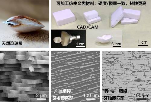 图1:新型仿生复合义齿材料的宏观外形、微观组织结构及其与天然贝壳的比较