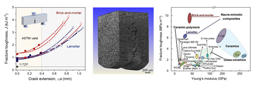 图3:新型仿生义齿材料的裂纹扩展阻力曲线与裂纹扩展形貌及其断裂韧性和模量与其他义齿材料的比较 |