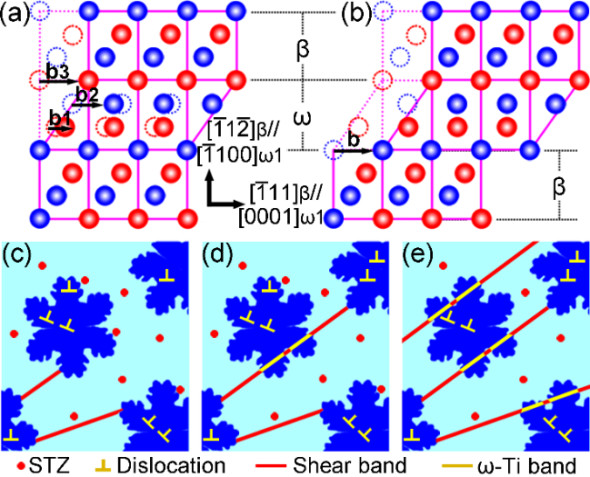 图3:β到ω的相转变以及非晶内生复合材料中剪切带与ω-Ti带的协同剪切机制 |