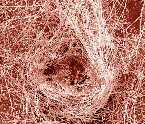 作者信息: 环境功能材料研究部-李财富-鸟巢 图片描述:本作品中一根根纤细的金属树枝交织在一起,形成一个宽敞、牢固的鸟巢。 实验方法:金属间化合物NdSn3在空气中放置,其表面就会生长出大量的金属锡丝,称之为锡晶须,晶须随机生长,可能会缠绕在一起。 取样仪器名称型号:FEI扫描电子显微镜 图片处理软件名称:Adobe Photoshop CS5